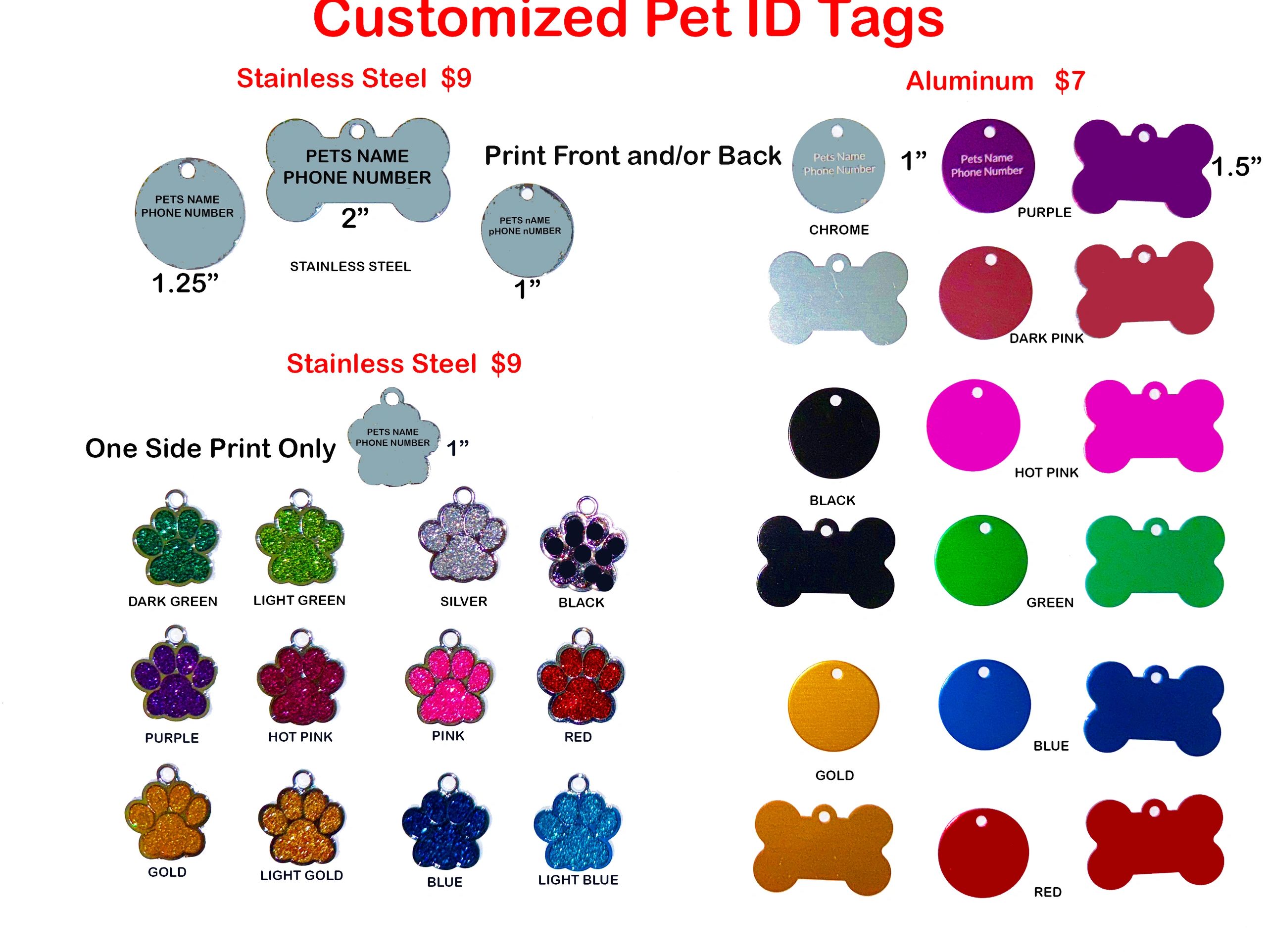 Stainless Steel or Aluminum pet ID tags. Engrave on front and/or back. Color available in aluminum and on the stainless steel paw prints. Stainless Steel is $9 per tag plus shipping/tax. Aluminum is $7 per tag plus shipping/tax. All include a ring for collar attachment.