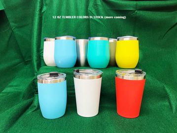 Cutomized 12 oz Stainless Steel Tumblers with lid and straw. Various color choices. Also come as a stemless wine tumbler or regular tapered style